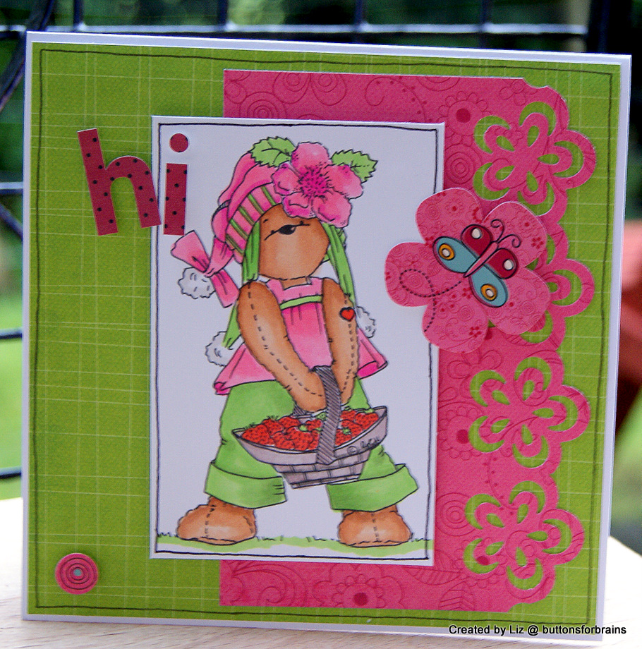 My card tonight features TeddyBea, looking very summery in her pink and green outfit. I'm glad she chose that outfit 'cos it matches my BoBunny papers perfectly!