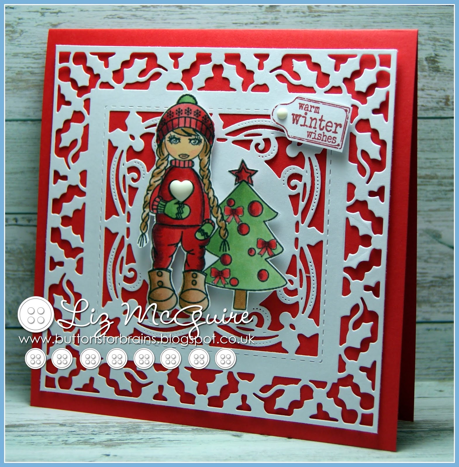 The image I have used is Leila Decorating from Sasyaki Glitter. I coloured using copic marker pens and the die cut background is 'ornate holly framed noel' by Creative Expressions.