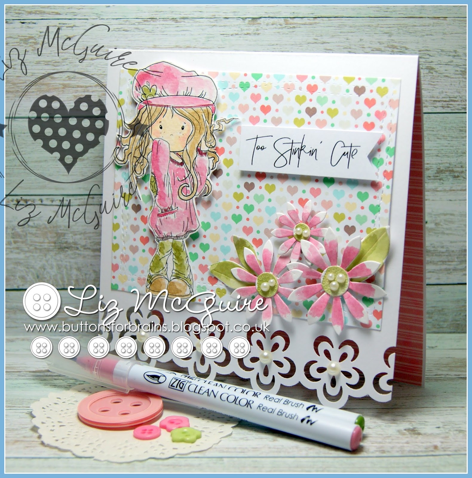 The background papers are also Polkadoodles and you can find them here. The daisies have been diecut from watercolour card and coloured the same way as Maddie, this means you have a perfect match!