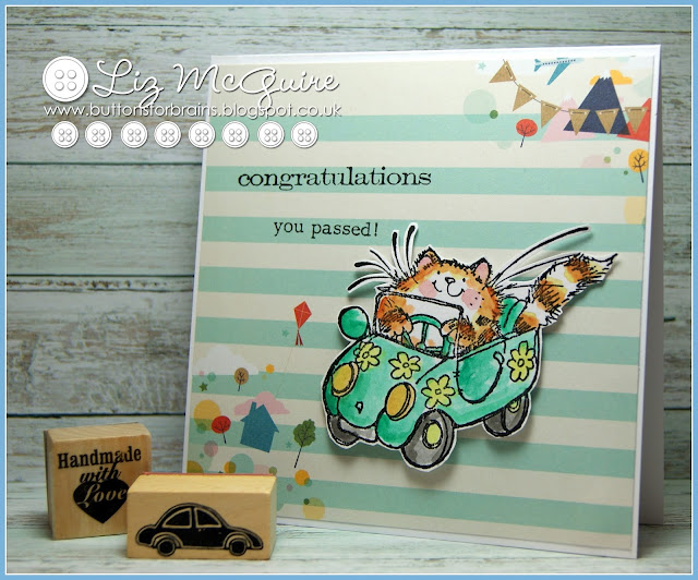 The card above features 'flower powered' and the one below is 'london cabby'. I coloured both images with my Inktense pencils. Both background papers are from the 'go now go' pad by Shimelle.