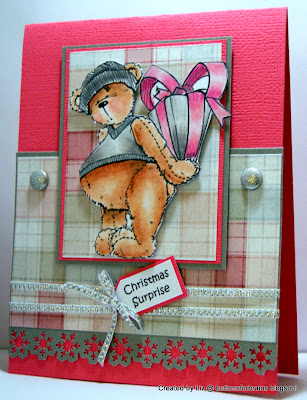 It's Tuesday and a new batch of TeddyBo's have been released, super cute, as always! I have used TeddyBo155 and coloured him with prisma pencils, NitWit papers, Martha Stewart punch, silver ribbon and brads.We are midway through our current challenge 'Christmas - red or green should not be seen'. So to be in with a chance of winning some Teddy's you need to get your entry in by Sunday 27th November.