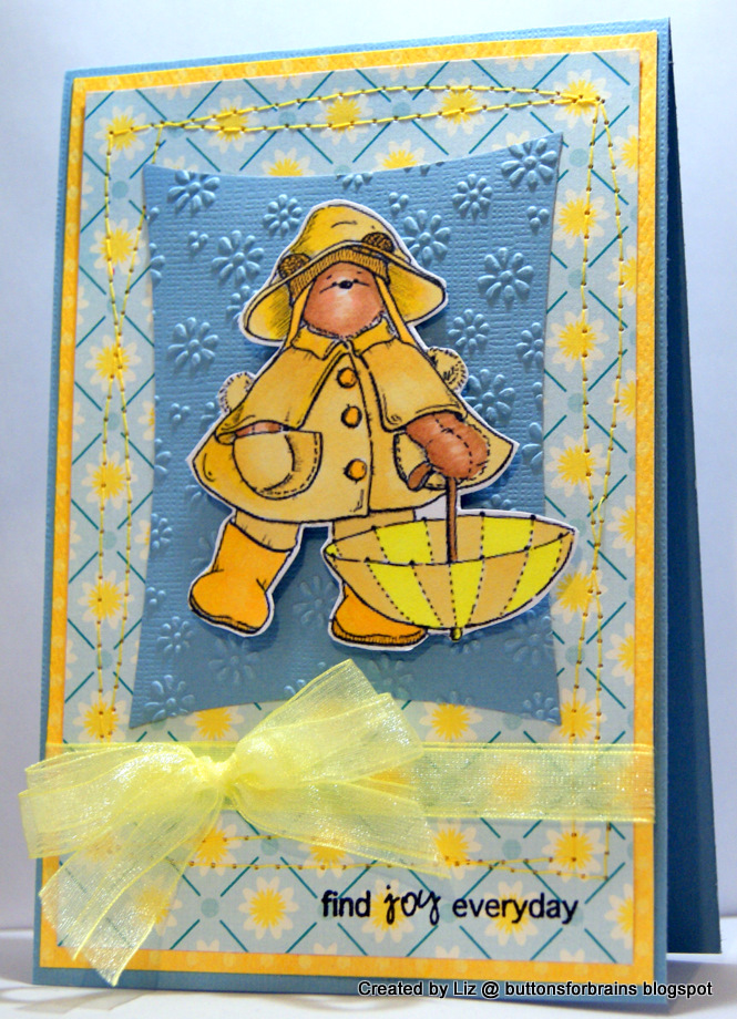 I used Teddy Bea 169 coloured with copics/promarkers and the papers are Echo Park. A daisy embossing folder, ribbon and some machine stitching to finish.
