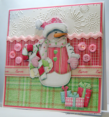 It's my fourth week with the girlies over on the Papertake challenge. Next week will be my last, aww! I'll miss you guys! Anyway, this week the challenge is....Christmas Crackers - make your Christmas favourites.I have used my favourite embossing folder, papers and decoupage snowman from the NitWit range and ricrac, 'love' ribbon and buttons from my favourite haberdashery shop 'SewSweet'. I'll be back later to share my TeddyBo Tuesday card- super cute new images.