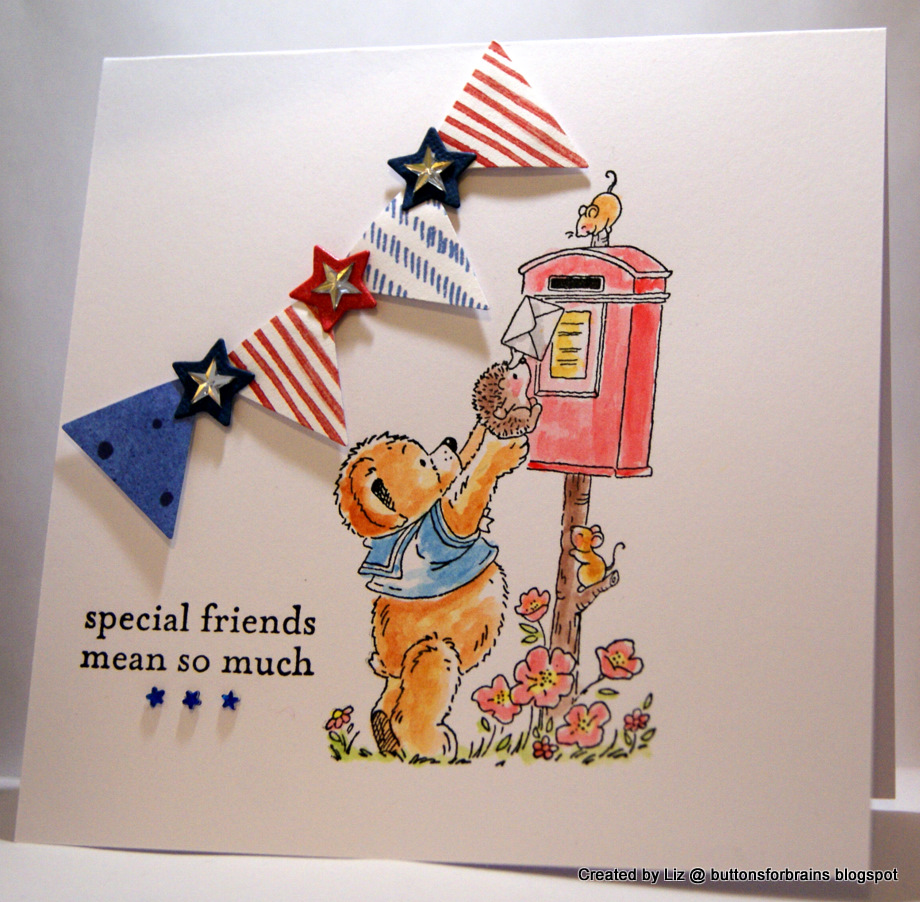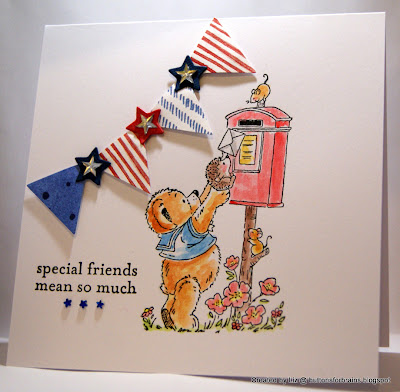For my card I used one of the new TeddyBea images, coloured with prisma pencils, some Hero Arts stamped bunting and a Penny Black stamped sentiment.