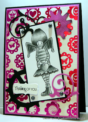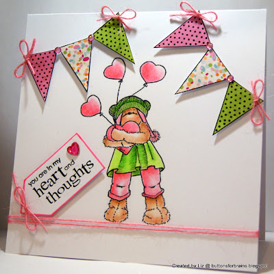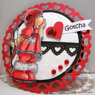 It's Tuesday, and that means there are new bears on the loose. Very romantic new bears! Perfect for valentines, weddings or anniversaries. I have used TeddyBea098 available here, and I figured her arrow had reached her 'bo'! I coloured with prisma pencils and dug out everything I had that could make a heart! Too many hearts? I s'pose on a romantic card you can never have too many hearts!