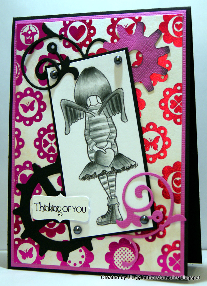 The second is an image from D'Arcy's Diaries, a new digi shop which opens on 12th January. Once again I coloured with pencils I used Bubblegum Hills paper by Kaisercraft, Tim Holtz gears die, Tim Holtz scroll die and black pearls.