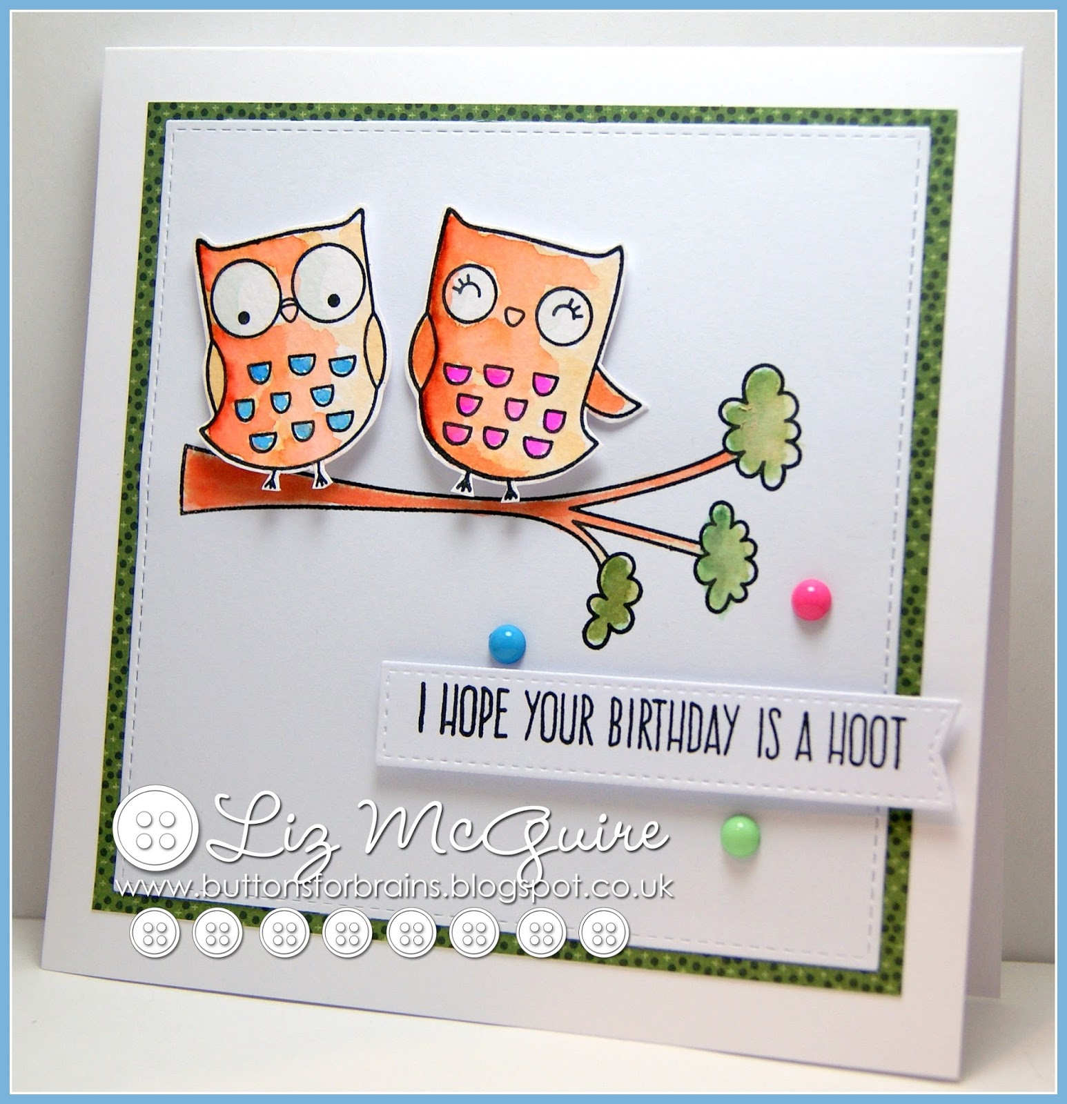 Hello. A quick and easy card to share today. The owls and sentiment are from 'I'm Owl Yours' and the branch is from 'Tweet on You' both by My Favourite Things. I did a loose bit of watercolouring with my ZIG pens. I fussycut the owls and popped them up on some foam pads - job done!