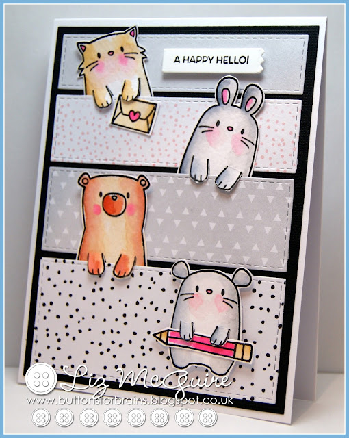 Hello. I've had this Mama Elephant stamp set for quite a wee while and this is the first time I've inked them up. Although I knew I loved these cute critters I really couldn't figure out what I wanted to do with them! The set is called 'page huggers' and I think you are supposed to make bookmarks or paperclips etc. Anyway, today I seemed to be a little inspired and coloured them up.