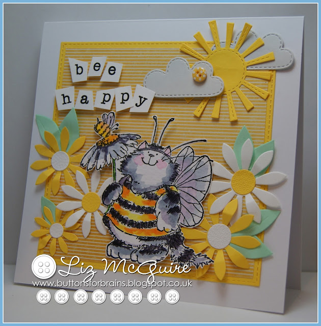 For my card I stamped, coloured and fussy cut my 'bee costume' Penny Black stamp. I used ZIG real brush pens to colour. I die cut the daisies, sun and clouds. The sentiment is stamped and then cut unevenly ( I used to do that a lot with sentiments so it's a bit of a blast from the past).