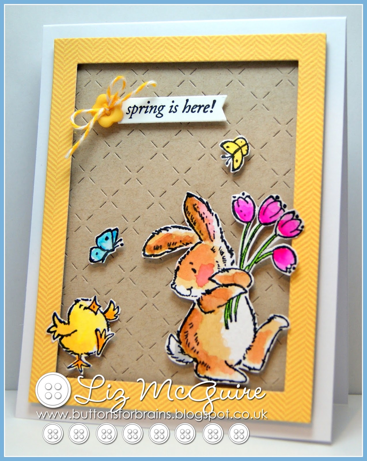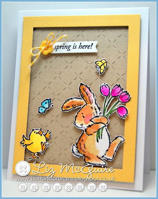 Hello. It's not quite here, but I hope it's not far away! Yep, I'm still using my ZIG real brush pens to colour. This time a wood mounted older Penny Black called 'what a spring'. The background is a die by L'il Inker.