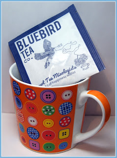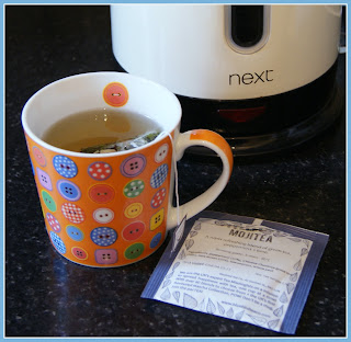 Now, as part of the blog post,  Debs and Celeste always share which fancy coffee they are drinking. I do like coffee but I'm really just a plain latte girl! I thought that might be a little bit boring so I'm having a 'Mojitea' in my favourite 'button' mug. It says it's a refreshing blend of green tea, peppermint and lime. To be honest the jury is still out - where's my Scottish Blend?