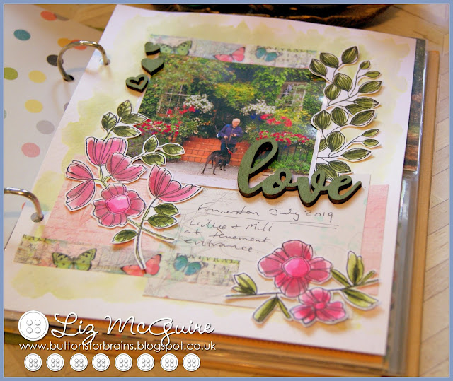 Hello. Today I'm sharing my regular make for Seven Hills Crafts. and it's a scrapbook page. I mainly scrap in albums that are 6"x8" with a mix of pocket pages and cardstock pages, like this one. I took this picture very recently. We were out and about in Glasgow and came across this gorgeous entrance to a tenement building. The flowers were so vivid and I immediately thought 'scrapbook page'!